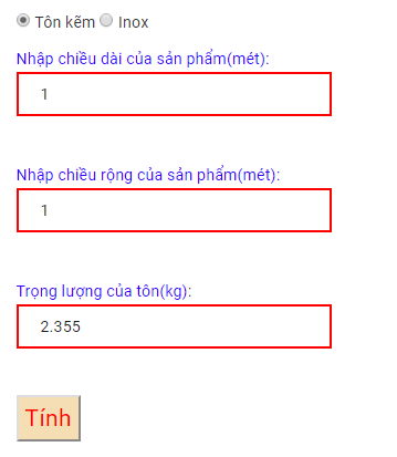 Ví dụ: tấm tôn kẽm, dài 1 mét, rộng 1 mét, và nặng 2.355kg thì nhập như sau